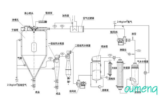 裝置**針對于有機(jī)溶劑,以使用循環(huán)氮氣而形成的惰性氣體介質(zhì)取代通常的空氣介質(zhì),來進(jìn)行噴霧干燥。除了能回收產(chǎn)品之外,尚可回收有機(jī)溶劑。針對有機(jī)溶劑低閃點或者微毒的特點,易燃易爆的特點**設(shè)計該套閉式循環(huán)噴霧系統(tǒng)。